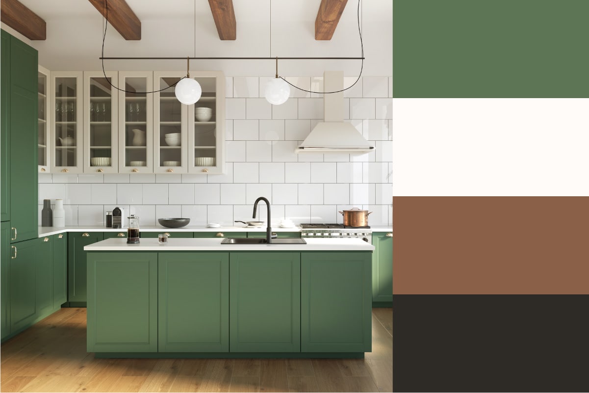 The kitchen might be one of the harder rooms to choose a color palette for. Itโs already a busy area, and too much color can make it feel even busier. If all-neutral kitchens arenโt your style, a good approach is choosing one bold color and a few neutrals to work with.